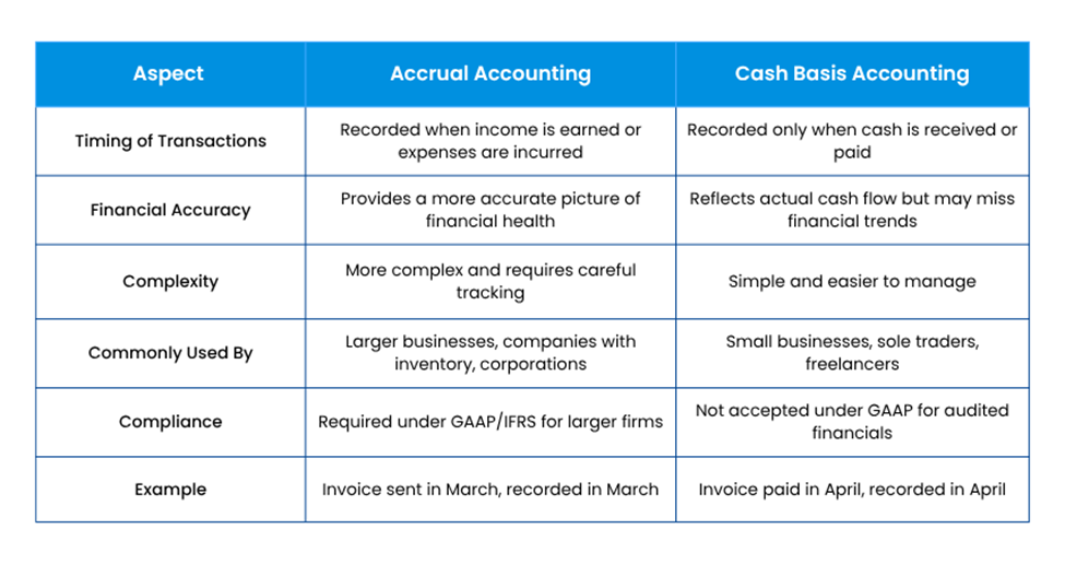 The following are the key points of comparison between Accrual and Cash Basis Accounting: