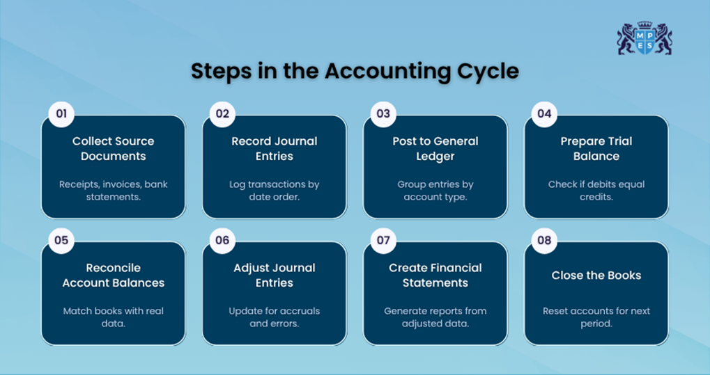 The steps in the Accounting Cycle follow an eight-step process that helps businesses record and report financial activity accurately. While the steps may vary by method, this approach keeps things simple. Below is a clear breakdown of each step in order: