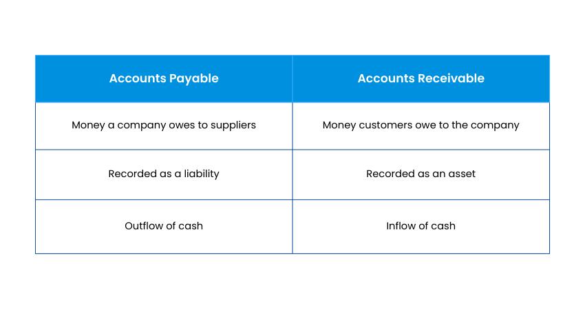 Accounts Payable refers to money owed to suppliers for purchases made on credit, recorded as a liability. Accounts receivable refers to money owed to the company by customers for goods or services provided, recorded as an asset. Both represent opposite sides of financial transactions.