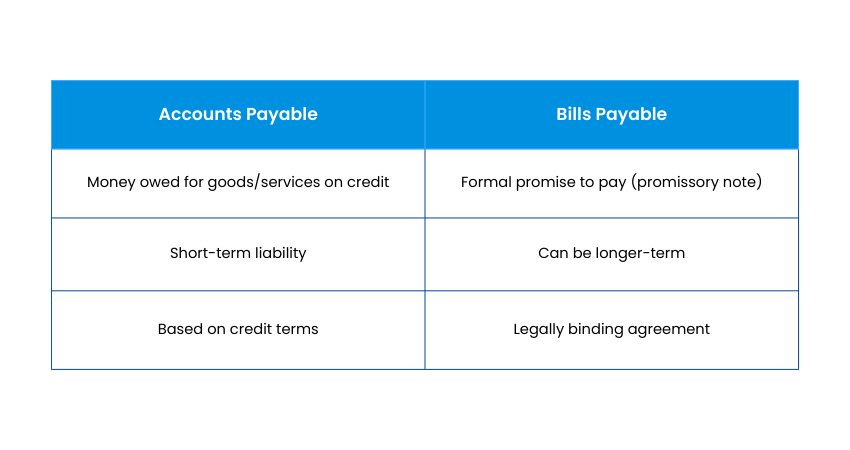 Accounts Payable is the money owed for goods or services bought on credit, usually short-term liabilities in the AP ledger. Bills payable refers to promissory notes or formal commitments to pay, often involving more formal agreements and potentially longer payment terms.