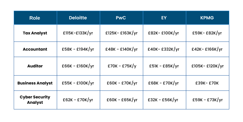 Salaries depend on country, role, and experience. Entry-level salaries are good and grow fast. Here is what professionals in Big Four Accounting Firms generally earn in the UK: