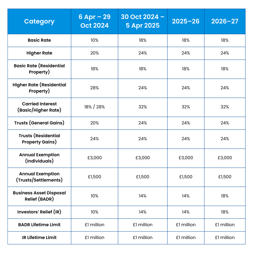 Capital Gains Tax rates in the UK have been updated for the 2025/2026 tax year. These changes affect how much tax individuals and trustees pay when selling assets like property or shares. Here are the new rates: