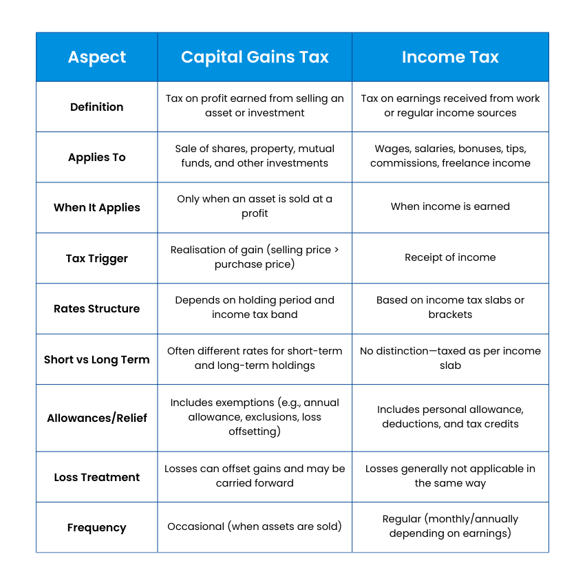 Income tax applies to most types of earned income, including wages, salaries, tips, commissions and earnings from freelance or contract work. Conversely, Capital Gains Tax is charged when you sell an asset or investment for a profit, which means you receive more than its original purchase price. Here are the key differences: