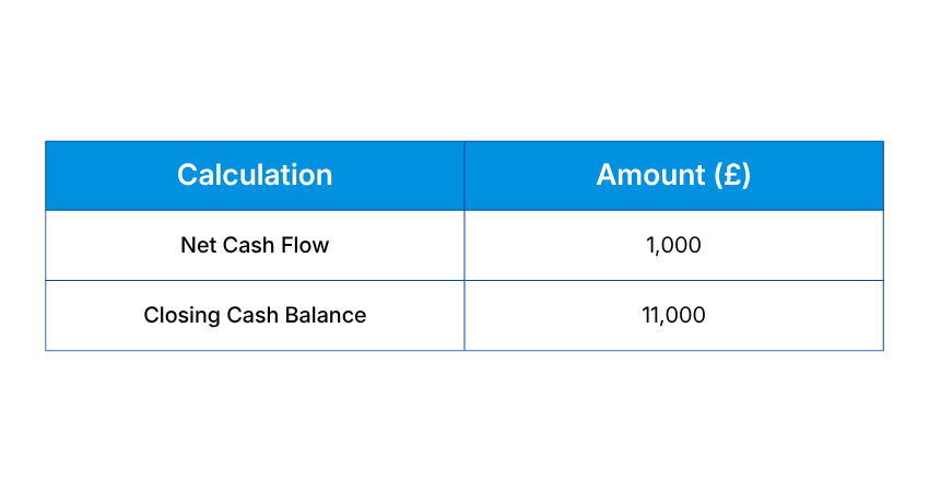 The business generated a positive Cash Flow of £1,000, increasing its total cash balance to £11,000. This indicates that the company is financially stable and able to manage its expenses effectively while continuing to grow.