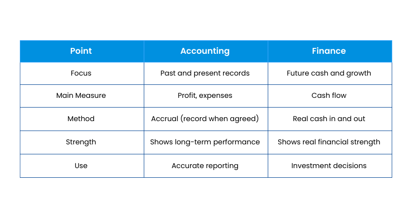 Finance and Accounting work together in every organisation, but they are not the same. In the Finance vs Accounting comparison, Accounting focuses on past and present records, while Finance plans for the future. Here is the key difference between Finance and Accounting.