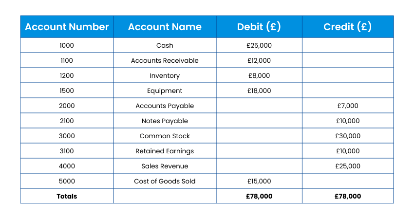 In this example, the Total Debits (£78,000) equal the Total Credits (£78,000), indicating the Trial Balance is balanced correctly.